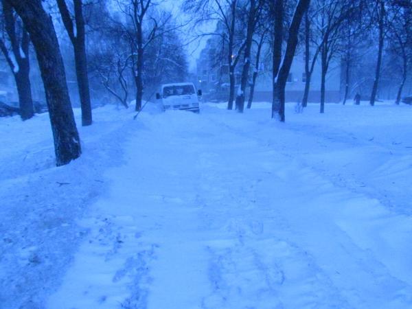 К часу дня силами жильцов сугробы на дороге были расчищены и движение возобновилось. Но снег продолжает идти.