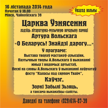 Царква Ўзнясення ладзіць літаратурна-музычную вечарыну-рэквіем, прысвечаную 90-гадоваму юбілею беларускага паэта Артура Вольскага (Артур Вольскі быў вернікам гэтай царквы).