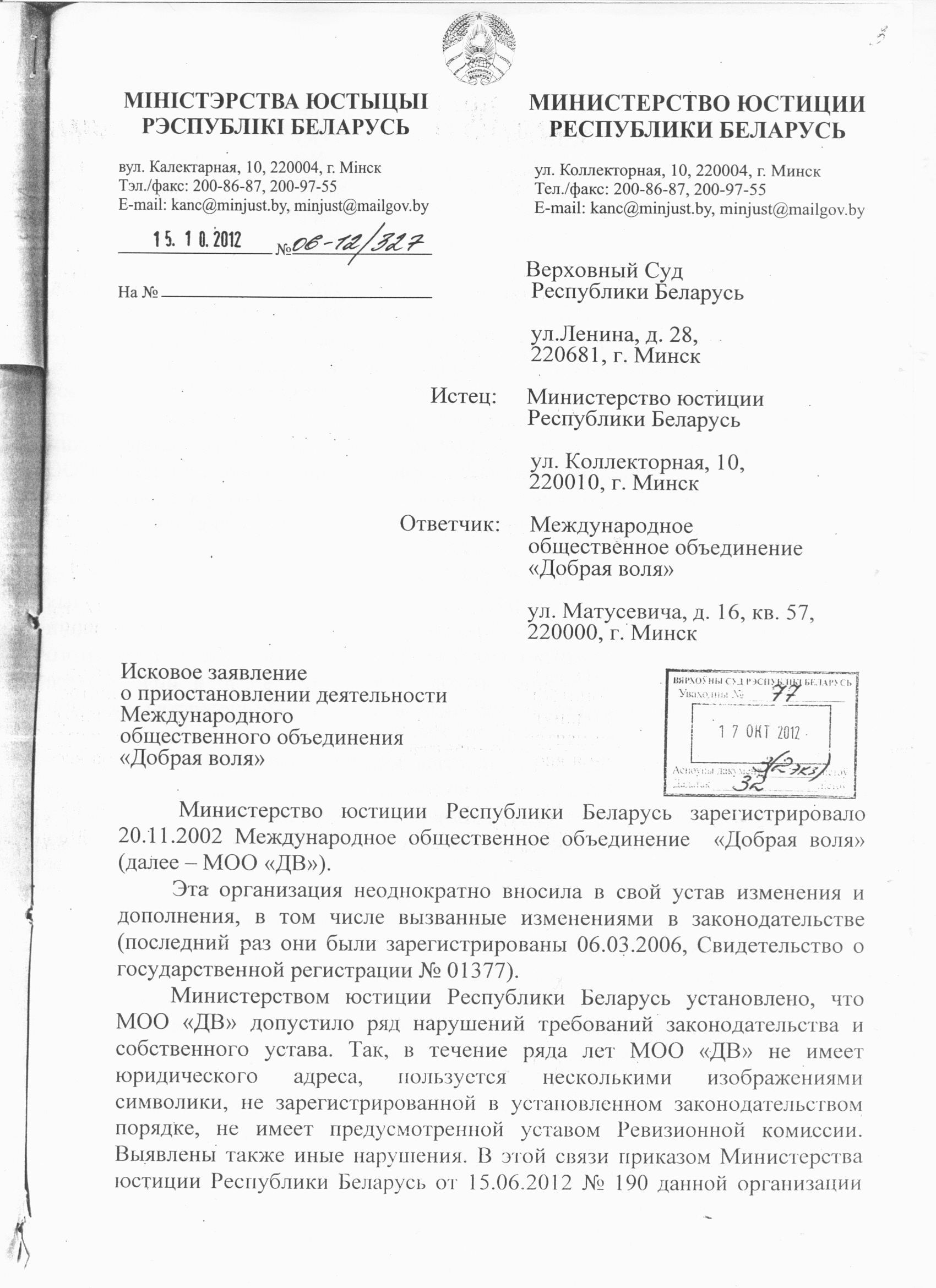 27 ноября церковь «Новая Жизнь» получила повестку от судебного исполнителя Высшего Хозяйственного суда Щербович О.Н., в которой предлагается в срок до 5 декабря 2012 года освободить здание церкви, распложенное по адресу город Минск, улица Ковалева, дом 72, и изготовить дополнительный комплект ключей для представителей ЖРЭО Московского района города Минска.